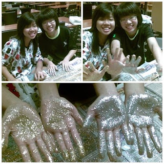 Yesterday, some of the members met up and helped the cg to "blingarize" the plain-looking suspenders. When i reach there at about 7.30pm, i can see that they are having "great" fun with those glitters(countless!) and suspenders!